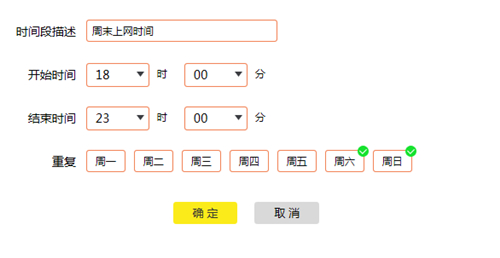 4、添加允許上網的時間段,以本例為準,添加周內和周末兩個上網時間段。如下: