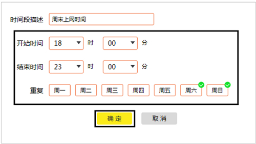 4、添加允許上網的時間段,以本例為準,添加周內和周末兩個上網時間段。如下: