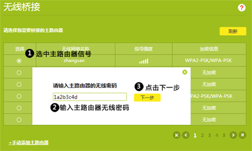 5、選擇主路由器信號,選擇掃描到的主路由器信號,并輸入主路由器的無線密碼,點擊 下一步: