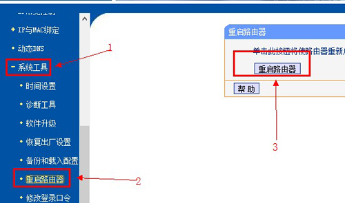 5、重啟路由器。左側導航欄,點擊【系統(tǒng)設置】,然后點擊【重啟路由器按鈕】,待重啟好后就生效了。