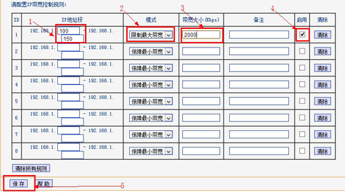 4、在“IP地址段”填寫上DHCP服務器地址池的開始地址和結束地址--->在“模式”下面選擇“限制最大帶寬”--->在“寬帶大小”列填寫允許使用的最大帶寬--->在“啟用”列下勾選對應的方框--->點擊“保存”。
