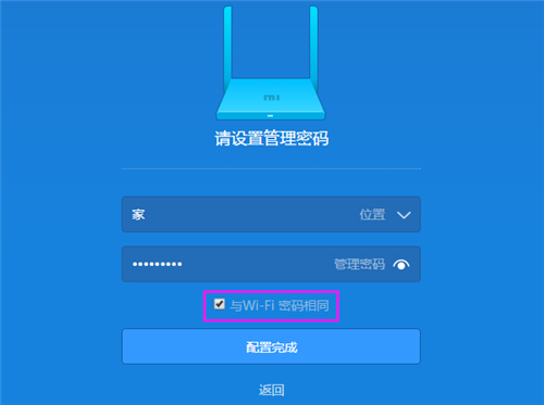 5、大家可以自定義設置“管理密碼”,也可以直接勾選“與WiFi密碼相同”,建議大家是勾選“與WiFi密碼相同”——>然后點擊“配置完成”。