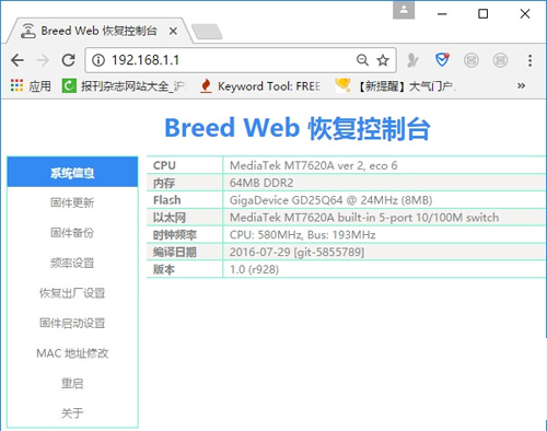 4、在瀏覽器中輸入192.168.1.1,就可以進入到Breed Web控制界面了,如下圖所示。