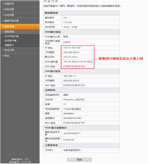 6、快速向導設置完點擊【確定】,設備重新啟動,請勿斷電。重啟完成后直接到【運行狀態】,WAN 口獲取到正確 IP 地址以后,則能夠上網了。