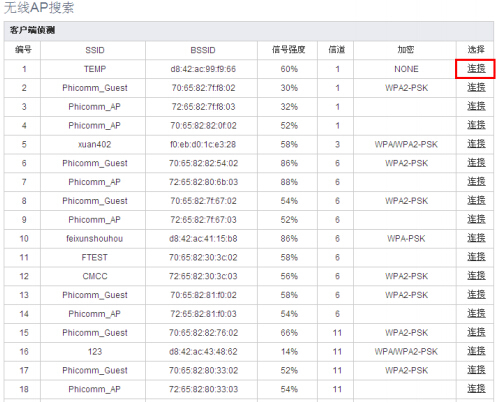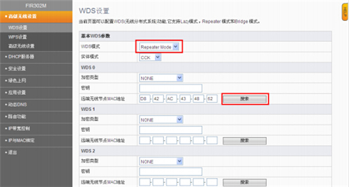 ④WDS 設置。(注意:此時需登陸修改后的 192.168.1.2 進入界面)選擇【repeater mode】,點擊【搜索】,彈出無線 AP 列表,找到主路由器的信號名稱,點擊后面【連接】,然后點擊下方保存(這里面的密鑰不用管)。