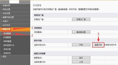 3、在FIR151M的設(shè)置界面,點(diǎn)擊“系統(tǒng)工具”——>“系統(tǒng)管理”——>在右側(cè)找到“軟件升級(jí)”——>點(diǎn)擊“選擇文件”。