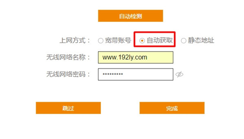 在未使用路由器情況下,電腦連接貓(入戶寬帶網線)后,自動就可以上網。如果你的寬帶與上面描述的一致,那么斐訊K2路由器中的“上網方式”,就應該選擇:自動獲取——>然后設置“無線名稱”、“無線網絡密碼”——>點擊“完成”。