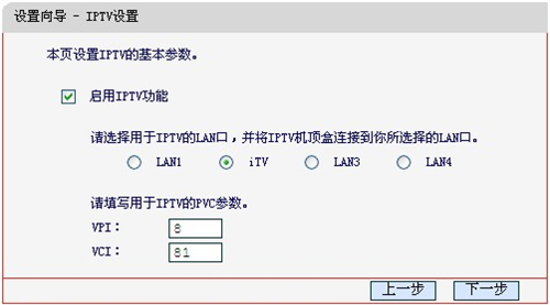 如果有IPTV應用,則勾選“啟用IPTV功能”,選擇一個LAN口作為連接IPTV機頂盒的端口,填寫正確的IPTV PVC(不同地區不一樣,請咨詢IPTV服務商);