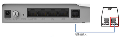 確保ADSL口接在分離器的MODEM口(如果沒有使用分離器則將電話線直接接在ADSL口上),如下圖所示。