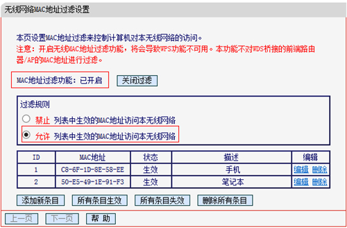 1、無線MAC地址過濾:主路由器開啟了無線MAC地址過濾,如果允許列表中沒有Mini路由器的MAC地址,會導致中繼不成功,如下圖所示: