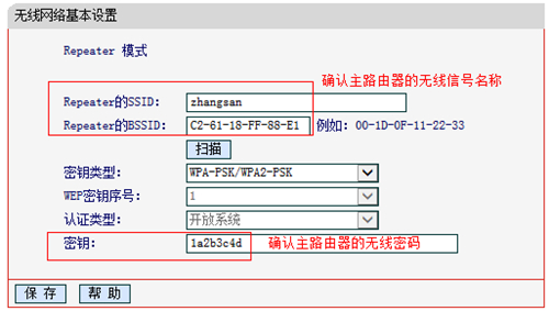 解決方法:在Mini路由器的 無線設置 >> 基本設置 中,確認中繼的SSID及無線密碼的信息是正確的。如下圖:
