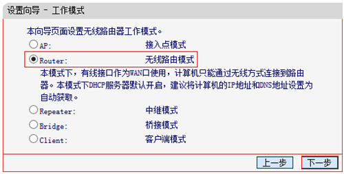7、選擇 Router:無線路由模式,點擊 下一步。