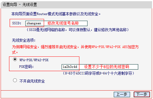 8、修改SSID (即無線網絡名稱),在 PSK密碼 的位置設置無線密碼,點擊 下一步。