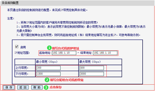 點擊“增加新的條目”——>“起始地址”和“結束地址”分別填寫:192.168.1.100 和 192.168.1.199——>上行最小帶寬為:200,最大帶寬為:500——>設置下行帶寬最小為:2500,最大帶寬為:3500——>設置完成點擊“保存”。