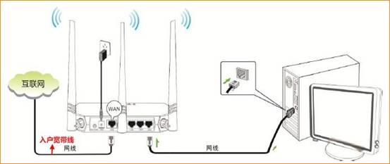 直接將入戶的網線接在路由器的WAN口,再找一根短網線,一頭接電腦,一頭接路由器LAN1/LAN2/LAN3任意接口,接線方式如下圖: