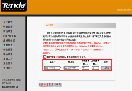 登陸管理界面后,點擊“帶寬管理”--“啟用”--填寫“起始IP“和“終止IP”(可以是單個IP,也可以是一個IP段)--填寫指定IP范圍內的電腦“下載速率”和“上傳速率”-“保存”,如下圖所示: