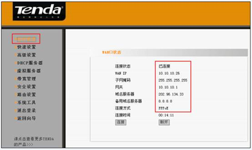 保存好后請點擊左上角“運行狀態—WAN口狀態”信息,如圖所示—則配置成功 。