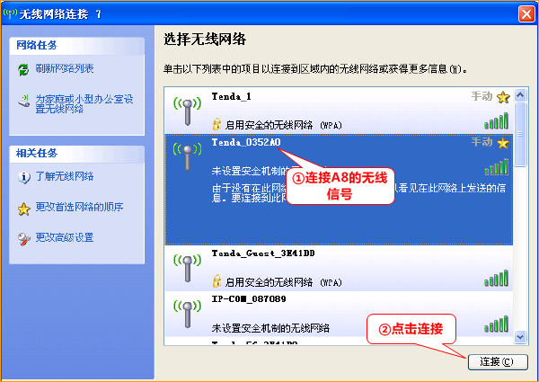 6、選中名為Tenda_XXXXXX的無線網絡(X為A8背面MAC地址的后六位),點擊“連接”