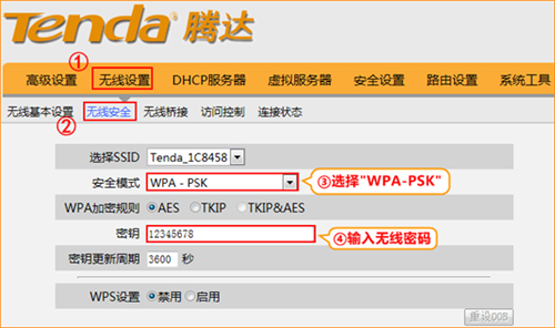1、對路由器進行加密。點擊“無線設置”—“無線安全” ,設置步驟如圖: