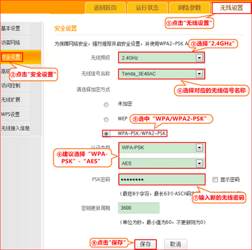 2、為了網絡不被蹭網,安全模式強烈建議選擇WPA-PSK,,加密規則選擇AES,密碼至少為8個數字和字母的組合;