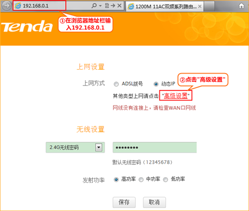 第一步:在瀏覽器中輸入:192.168.0.1 按回車鍵 ,在跳轉的頁面中點擊“高級設置”