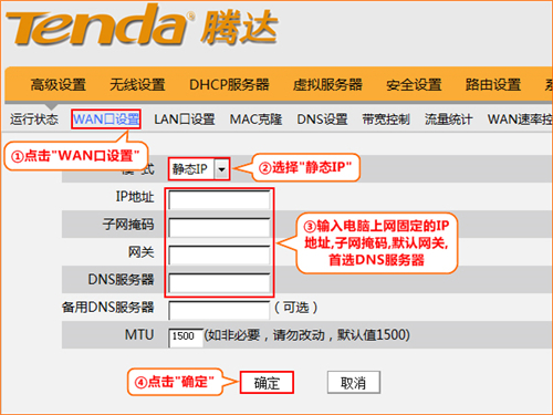 2、在頁面中點擊“高級設置”-“WAN口設置”,選擇模式為:“靜態IP”,輸入電腦上網固定的IP地址,子網