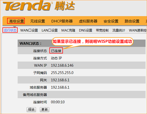 如果WAN口連接狀態顯示“已連接”,則證明中繼成功。