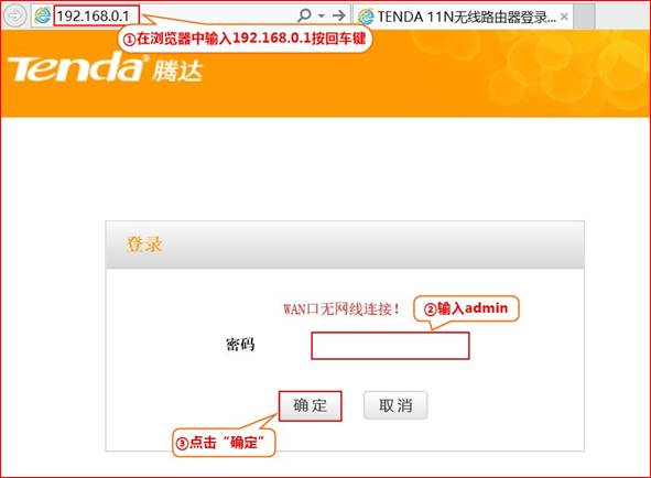 1、在瀏覽器中輸入:192、168、0、1 按回車鍵,在跳轉(zhuǎn)的頁面中輸入密碼 admin 點擊“確定”