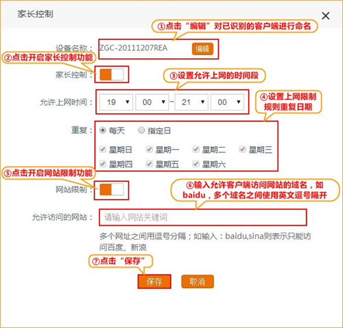 第四步:選擇需要控制的設備,設置允許上網的時間和允許訪問的網站。