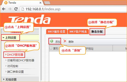 點擊上網(wǎng)設置->DHCP服務器->靜態(tài)分配,點擊“添加”按鈕。