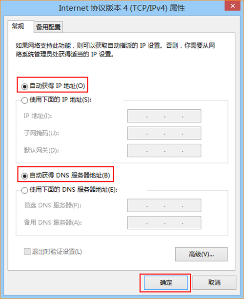 4.選擇“自動獲得IP地址”“自動獲得DNS服務器地址”,確定即可:
