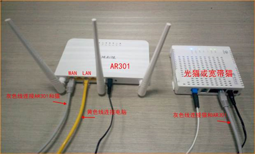 將貓分出來一根網線接路由器的WAN口(藍色),再找一根網線,一頭接電腦,一頭接路由器1/2/3任意接口(黃色),接線方式如下圖: