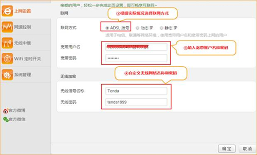 2.在上網設置中選擇“ADSL撥號” ,輸入寬帶帳號和密碼,“確定”即可,參考如下設置步驟