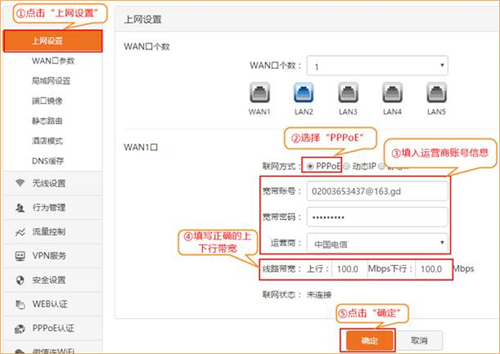 ①如果您是撥號上網用戶,聯網方式選擇“PPPoE”,然后輸入運營商給您的寬帶賬號與密碼,選擇您使用的運營商,在“線路帶寬”處填寫運營商提供的上行與下行帶寬。繼續輸入您申請的帶寬后點擊“確定”即可聯網;