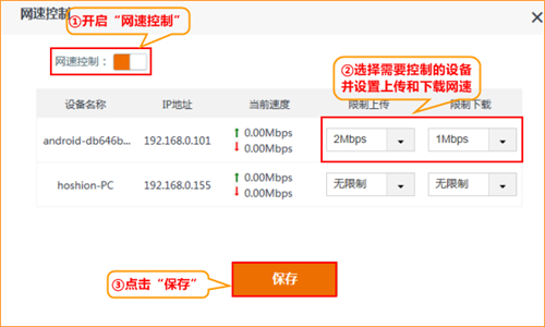 3、選擇所要控制的設備并設置上傳和下載速率: