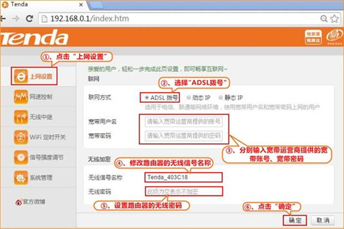 4、點擊“上網設置”,選擇聯網方式為“ADSL撥號”,輸入運營商提供的寬帶賬號及寬帶密碼,點擊“確定”,如下圖: