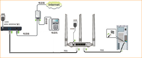 1、電話線接入的用戶(請準備2根短網(wǎng)線),將電話線(比較細的那根線)接“貓”的line口(比較小的那個口),“貓”分出來一根網(wǎng)線接路由器的WAN口,再找一根短網(wǎng)線,一頭接電腦,一頭接路由器1/2/3任意接口,接線方式如下圖: