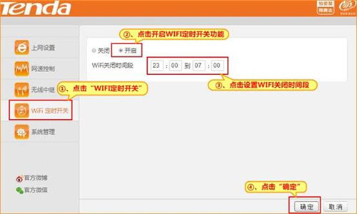 2、在路由器左側菜單中點擊“WIFI定時開關”,在打開的頁面中進行相應設置,參考如下操作步驟: