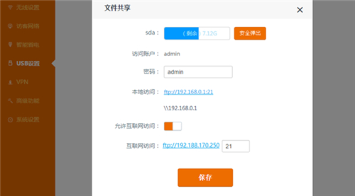 ① 登錄路由器管理頁面,進入『USB設置』> 文件共享。查看本地訪問的地址:此處為FTP服務器 ”ftp://192.168.0.1:21”;Samba服務器“//192.168.0.1”。