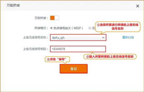 8、開啟“萬能橋接”,橋接模式選擇“熱點信號放大(WISP)”,在設備自動掃描到的無線信號中選擇所需中繼的上級無線信號名稱,并輸入密碼,點擊“保存”參考如下設置步驟: