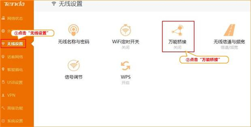 7、進入路由器的設置界面后,點擊“無線設置”,選擇“萬能橋接”如下圖: