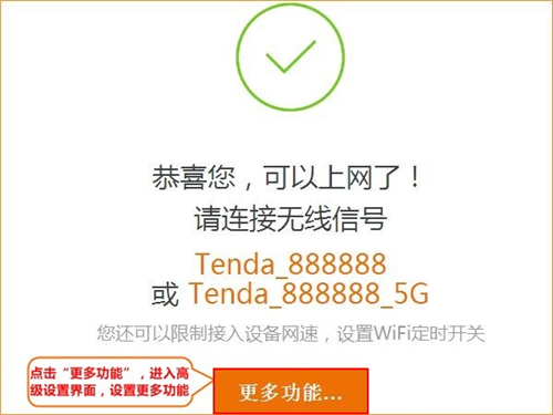 6、“設(shè)置完成,路由器正在聯(lián)網(wǎng)中,請(qǐng)稍候…”,等待大約10秒鐘后,在跳轉(zhuǎn)界面點(diǎn)擊“更多功能”,參考如下步驟: