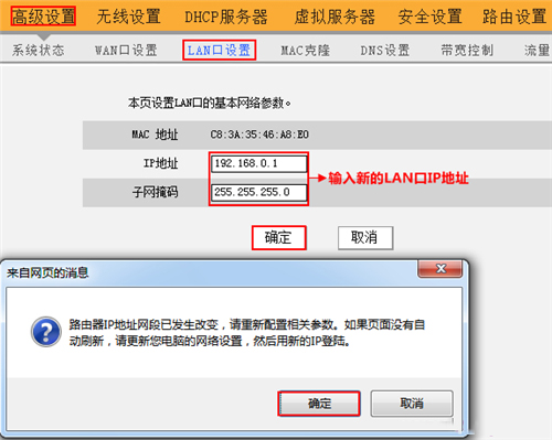 3、點擊“高級設置”——>“LAN口設置”——>在“IP地址”選項后面輸入新的IP地址——>點擊“確定”。