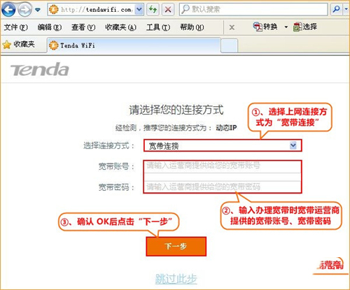 在開通寬帶的時候,運營商會提供一個寬帶賬號、寬帶密碼給用戶;且在未使用路由器的時候,電腦上需要使用“寬帶連接”程序,填寫寬帶賬號、密碼進行撥號,撥號成功后,電腦就能上網。如果你的寬帶情況與上面介紹的一致,則這里的“連接方式”就應該選擇:寬帶連接——>然后填寫寬帶運營商提供的“寬帶賬號”、“寬帶密碼”——>點擊“下一步”。