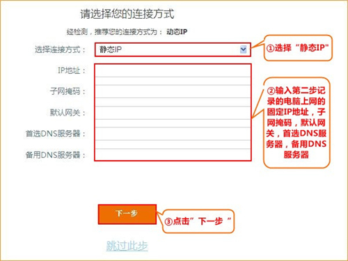 在開通寬帶的時候,運營商會提供一個IP地址、子網掩碼、網關、2個DNS給用戶;在未使用路由器的時候,需要在電腦本地連接中填寫寬帶運營商提供的IP、子網掩碼、網關、DNS,如下圖所示,然后電腦就可以上網了。如你的寬帶與上面介紹的相符,這里的“上網方式”應該選擇:靜態IP——>輸入運營商提供的靜態IP地址信息——>點擊“下一步”。