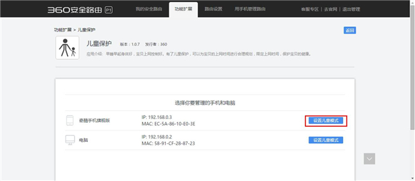 打開兒童保護(hù)功能設(shè)置界面后,點擊設(shè)備名稱后面的設(shè)置兒童模式,如下圖