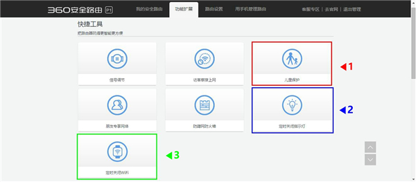 兒童保護(hù)(mini路由則為兒童模式) 或 定時關(guān)閉指示燈 或 定時關(guān)閉WiFi,如下圖