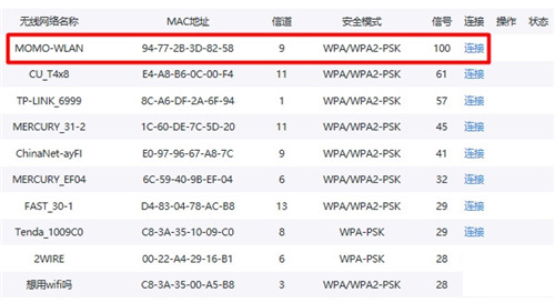 6、在搜索結(jié)果中,找到主路由器的無(wú)線信號(hào),選擇:連接。