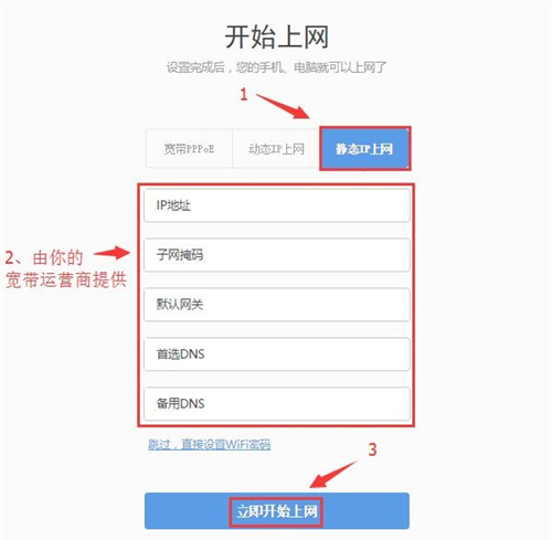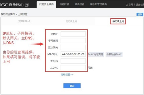 ③靜態IP上網:開通寬帶的時候,運營商會提供一個靜態IP地址、子網掩碼、默認網關、DNS信息給你。在未使用路由器時,需要在電腦本地連接(以太網)中,填寫寬帶運營商提供的靜態IP地址信息,然后電腦才能上網。那么在設置360 P1路由器上網時,就應該選擇:靜態IP上網——>然后填寫寬帶運營商提供的IP地址、子網掩碼、默認網關、DNS。
