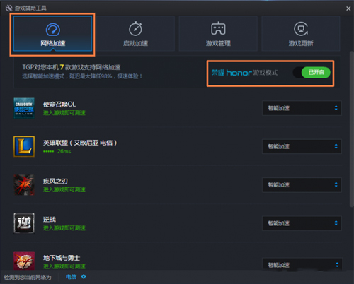 3、選擇【游戲加速】。點擊【游戲加速】開啟或關閉按鈕。